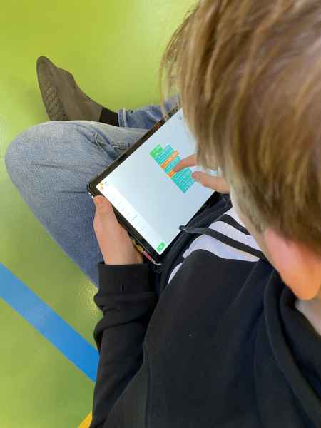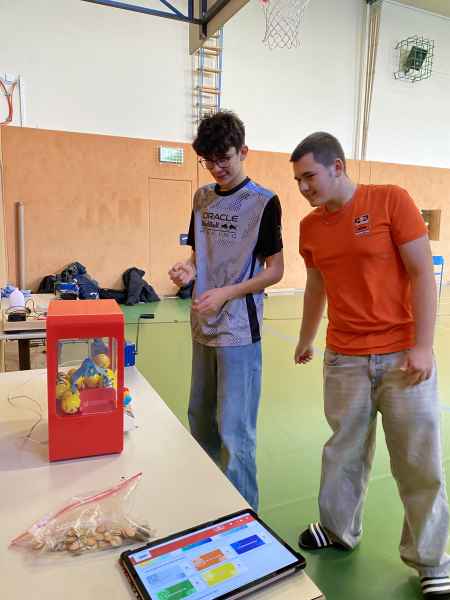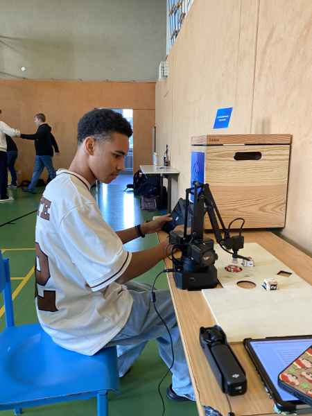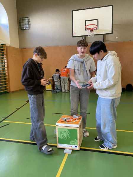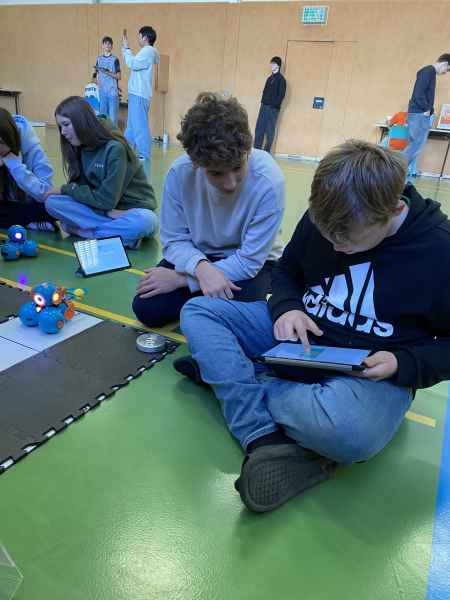 In der Station Robotik programmierten die Schüler:innen den Dash-Roboter und führten ihn durch ein selbst gestaltetes Labyrinth. An zwei weiteren Stationen zur Künstlichen Intelligenz drehte sich alles um „Stimme und KI“ sowie „Bilder und KI“: Mit Hilfe von Sprachsteuerung wurden Rätsel gelöst und eigene Geschichten erfunden, außerdem entstanden kreative Bilder allein durch Texteingabe in ein KI-Programm.
