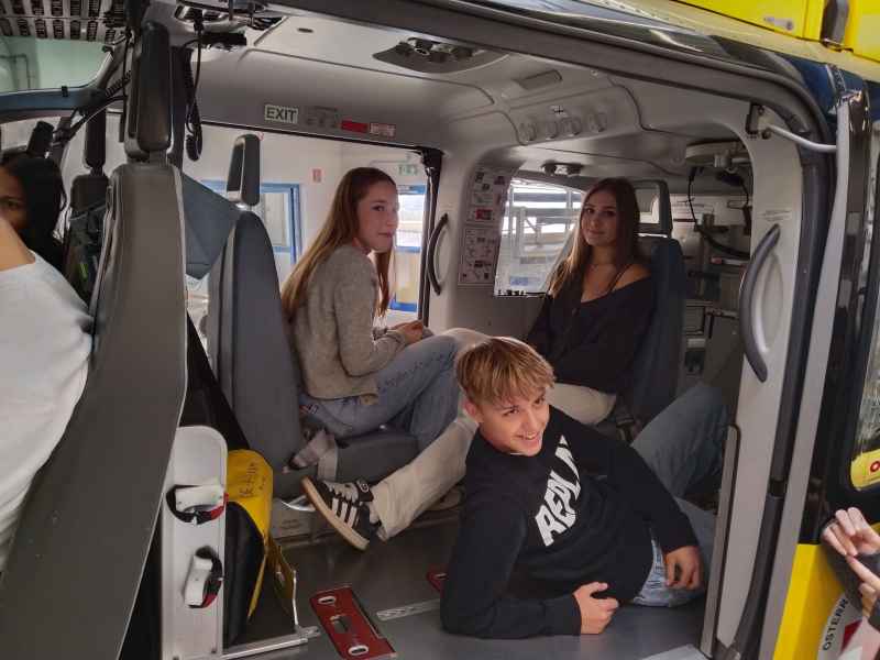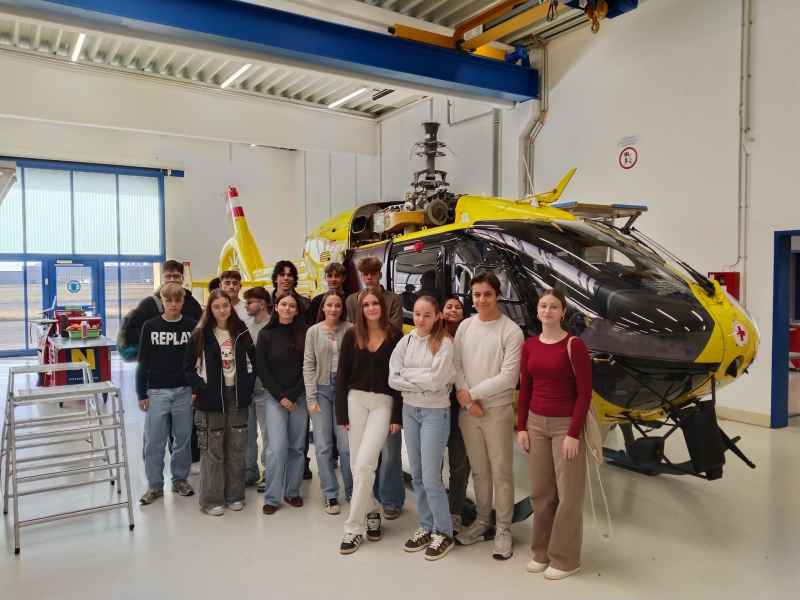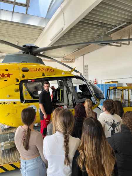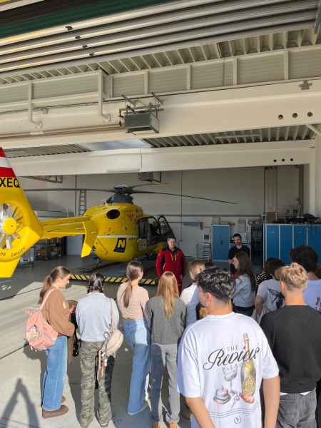 Zum Abschluss bot sich ein besonderes Highlight: Gemeinsam mit Pilotinnen/Piloten und Notärztinnen/Notärzten der Flugrettung konnten die Jugendlichen ins Gespräch kommen und für das Gruppenfoto den Hubschrauber sogar aus der Halle schieben. Ein äußerst informativer und eindrucksvoller Tag!